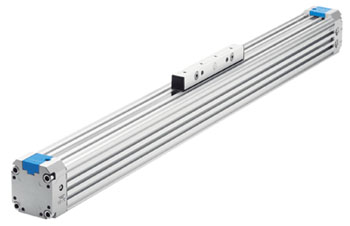 Der kolbenstangenlose Linearantrieb überträgt seine Kraft über eine formschlüssige Kolben-Mitnehmerkonstruktion und ist durch ein geschlitztes Profilrohr verdrehgesichert.