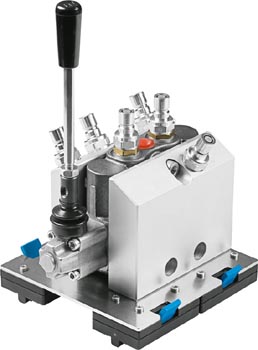 Das Ventil dient zur Steuerung des Volumenstroms. Es wird die Menge und die Richtung des Volumenstroms gesteuert. Die Mittelstellung ist federzentriert. Über den Handhebel wird der Kolben aus seiner Mittelstellung gegen die Feder geschoben.