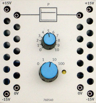 Das P-Glied ist ein Übertragungsglied aus der Regelungstechnik mit proportionalem Übertragungsverhalten. Das Eingangssignal/-potential an Eingang 1 wird um den einstellbaren Proportionalbeiwert Kp verstärkt und als Ausgangssignal/-potential an Ausgang 2 ausgegeben. Bei einem Proportionalbeiwert kleiner als 1 spricht man nicht von einer Verstärkung, sondern von einer Dämpfung. Um die Schaltkreiserstellung übersichtlich zu halten, sind die notwendige Masse (0 V) und die Versorgungsspannung nicht als Anschlüsse herausgeführt, sondern intern verdrahtet.