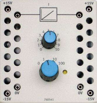 Das I-Glied ist ein Übertragungsglied aus der Regelungstechnik mit integralem Übertragungsverhalten. Das Eingangssignal/-potential an Eingang 1 wird über die Zeit aufsummiert und ergibt das Ausgangssignal/-potential an Ausgang 2. Mit dem Integrierbeiwert kann die Geschwindigkeit eingestellt werden, mit welcher das Eingangssignal integriert wird. Um die Schaltkreiserstellung übersichtlich zu halten, sind die notwendige Masse (0 V) und die Versorgungsspannung nicht als Anschlüsse herausgeführt, sondern intern verdrahtet.