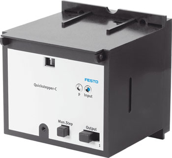 The Quickstepper is a ready to be fitted, mechanical/pneumatic control device with 12 in- and outputs. The outputs are successively synchronized with the input signals.