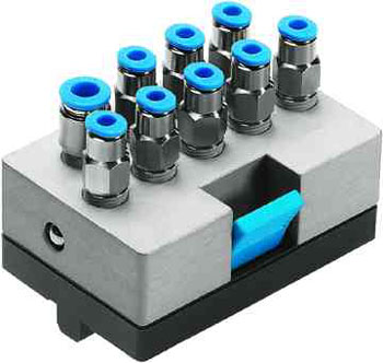A T-junction joins up to four pneumatic lines, thus having a single pressure potential. Note that T-junctions are introduced automatically by FluidSIM when dropping the line drawing cursor onto another line in Edit Mode.