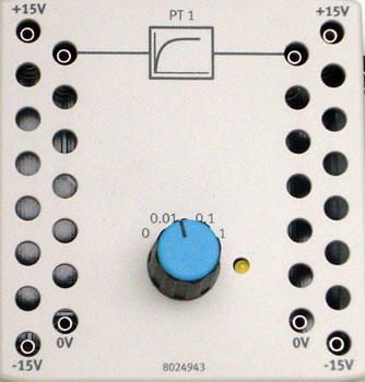 The PT1 element is a first-order proportional delay element used in closed-loop control technology. The input signal/potential at input 1 is amplified or attenuated by proportional-action coefficient Kp and delayed by delay time T, and is read out as the output signal/potential at output 2. In order to keep circuit wiring as straightforward as possible, required earthing (0 V) is not led out as a terminal, but rather wired internally.