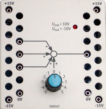 The summator element is a closed-loop control technology component. An output signal/potential is generated at output 4, which corresponds to the sum of the three input signals/potentials at inputs 1 through 3. In order to keep circuit wiring as straightforward as possible, required earthing (0 V) and supply voltage are not led out as terminals, but rather wired internally.
